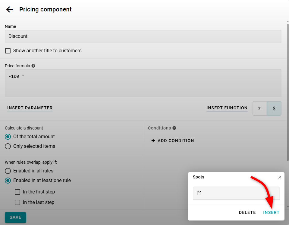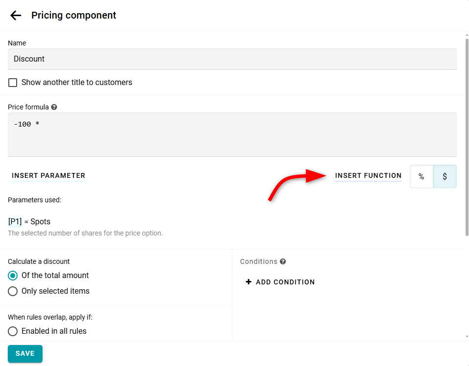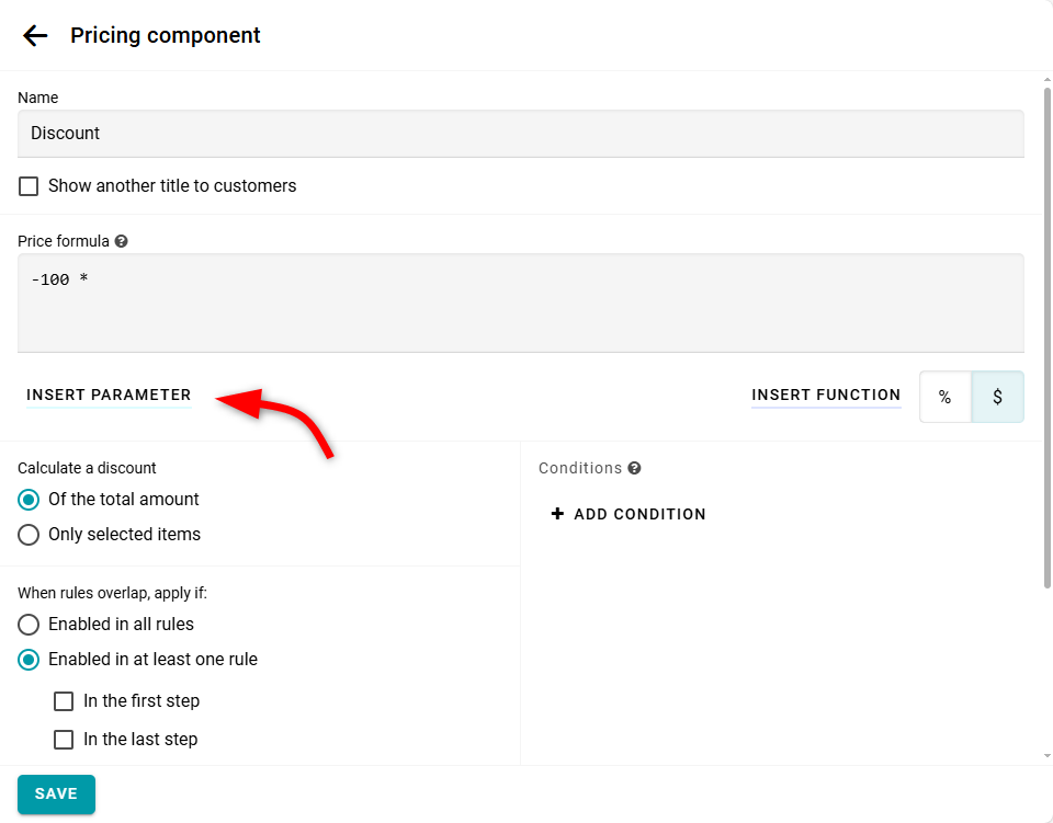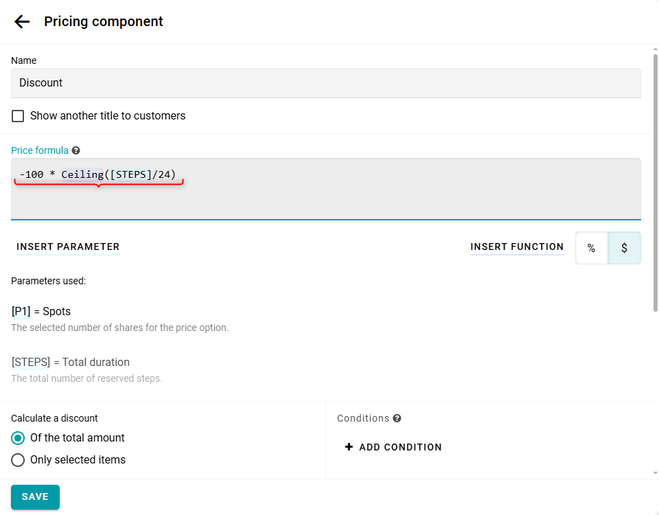 When creating discounts and surcharges, you define a formula to calculate the amount. The system automatically calculates this amount when the order is placed. The amount should be negative for discounts and positive for surcharges. The formula can return either an absolute value (in currency) or a percentage of the cost. Most importantly, a formula can include parameters and functions.