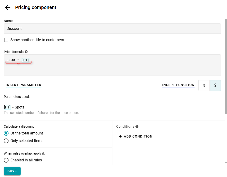 In the formula, you can use reservation parameters. Parameters must be enclosed in square brackets. For example: 100 * [PARAMETER].