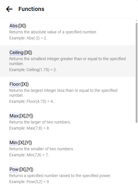 In addition to standard arithmetic operations, you can use the following functions. To add a function, click the Insert function button.
