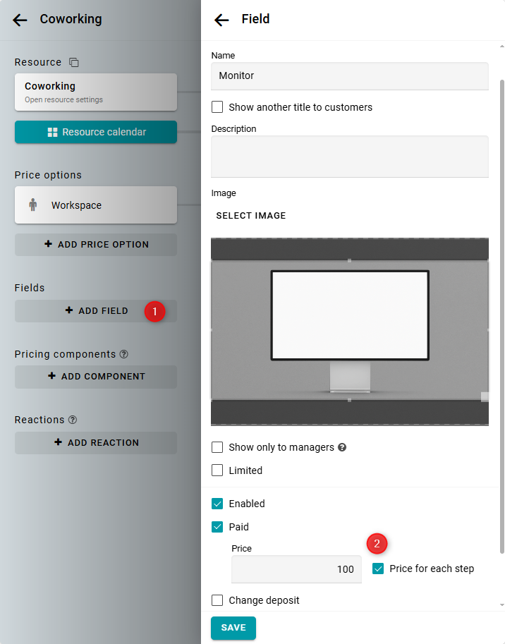 In the field settings, select the Paid checkbox and enter the price. Then, check the Price for each step option. This means the specified price will be multiplied by the number of steps—for example, the number of hours booked for hourly rentals. For instance: 'Monitor', $100 per day.