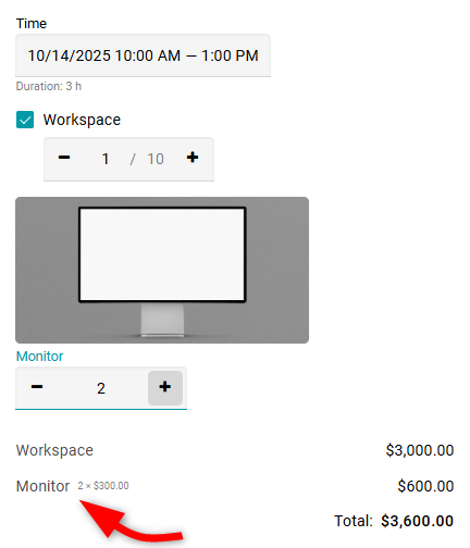 Let's see the result. Book a coworking space with two monitors at $100 per day for 3 days: