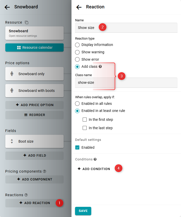 Let's use the "Snowboard rental" resource as an example. In the resource configuration, click Add reaction.
