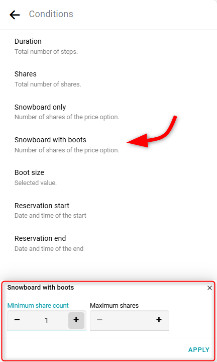Select the condition that one share of the "Snowboard with boots" price option is selected, and save it.