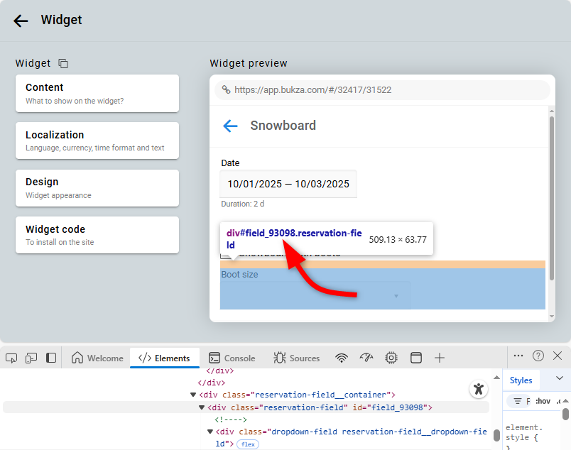 Next, you need to write a simple CSS rule to hide the field in the form. Go to the widget and select an available time. The reservation form will appear with the field you want to control. Open the page markup and find the ID of this field. Right-click on the field and select View the code. In our example, the field ID is field_93098.