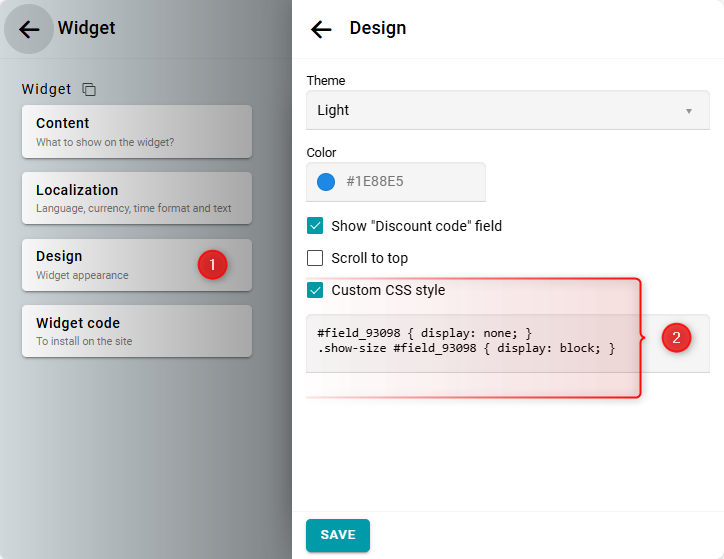 Now, when this price option is selected, the CSS class show-size will be added to the reservation form in the widget.