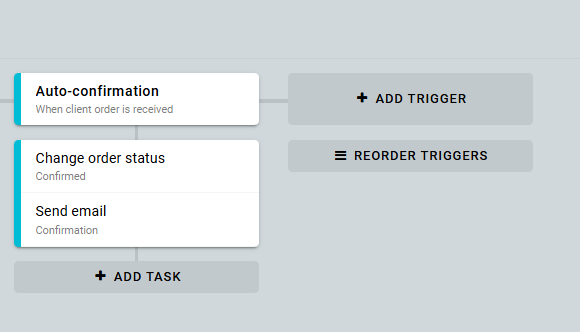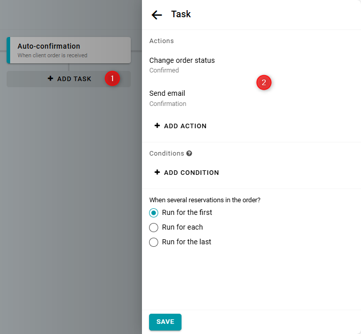 Then, add two actions to the task: change the status to "Confirmed" and send a "Confirmation" email.