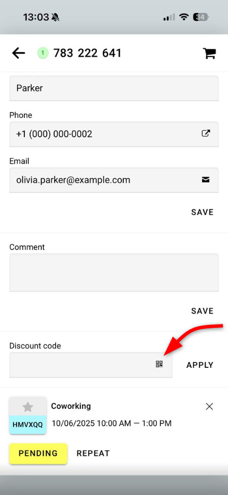 Simply tap the scan button next to the code field, and the code will be added to the order.