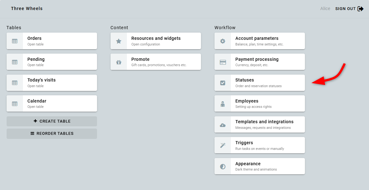 To configure statuses, go to the dashboard and open Statuses.