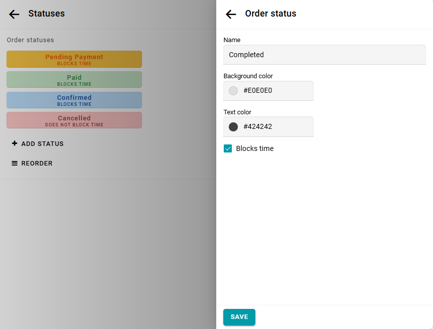 The order status also determines whether the time booked in the order is blocked on the calendar. The Blocks time parameter can only be set when creating a status and cannot be changed afterward.