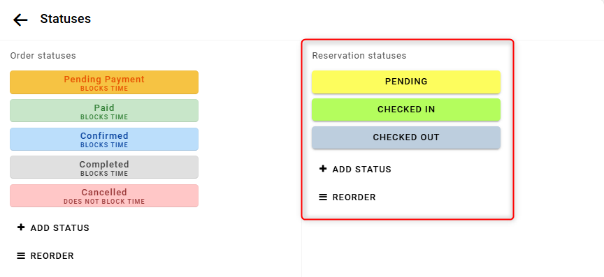An order can include multiple reservations. Both the order and its reservations have their own statuses. You can create, modify, delete statuses, and change their sorting order.