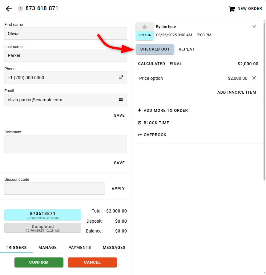 Reservation statuses can also be changed using a trigger. To do this, add a task with the action Change reservation status to the appropriate trigger.