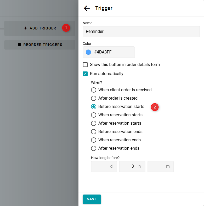 Create an automatic trigger called "Reminder". Set it to run 3 hours Before reservation starts.