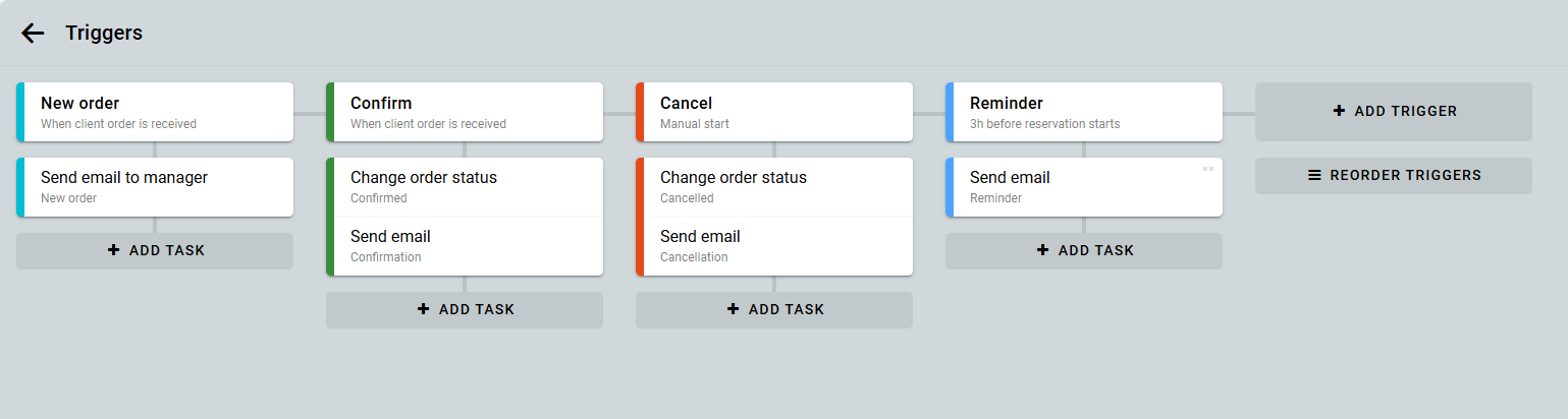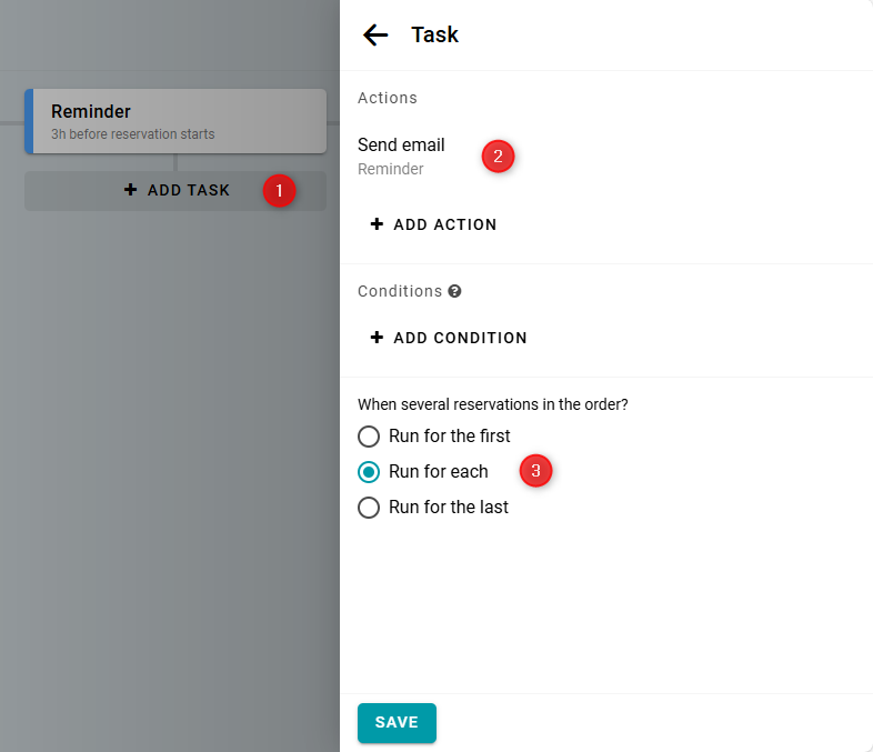 Add a task to the trigger. Then add the Send email "Reminder" action. Also, specify that the trigger should Run for each reservation.
