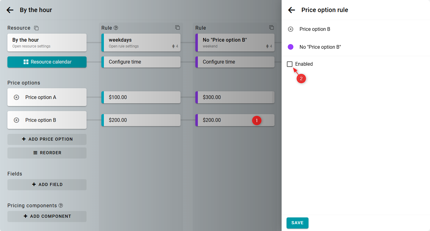 Click the intersection of the new rule and the price option you want to make unavailable. In the settings form that opens, uncheck the Enabled box.