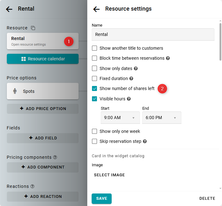 Open the resource parameters and enable the Show number of shares left checkbox.