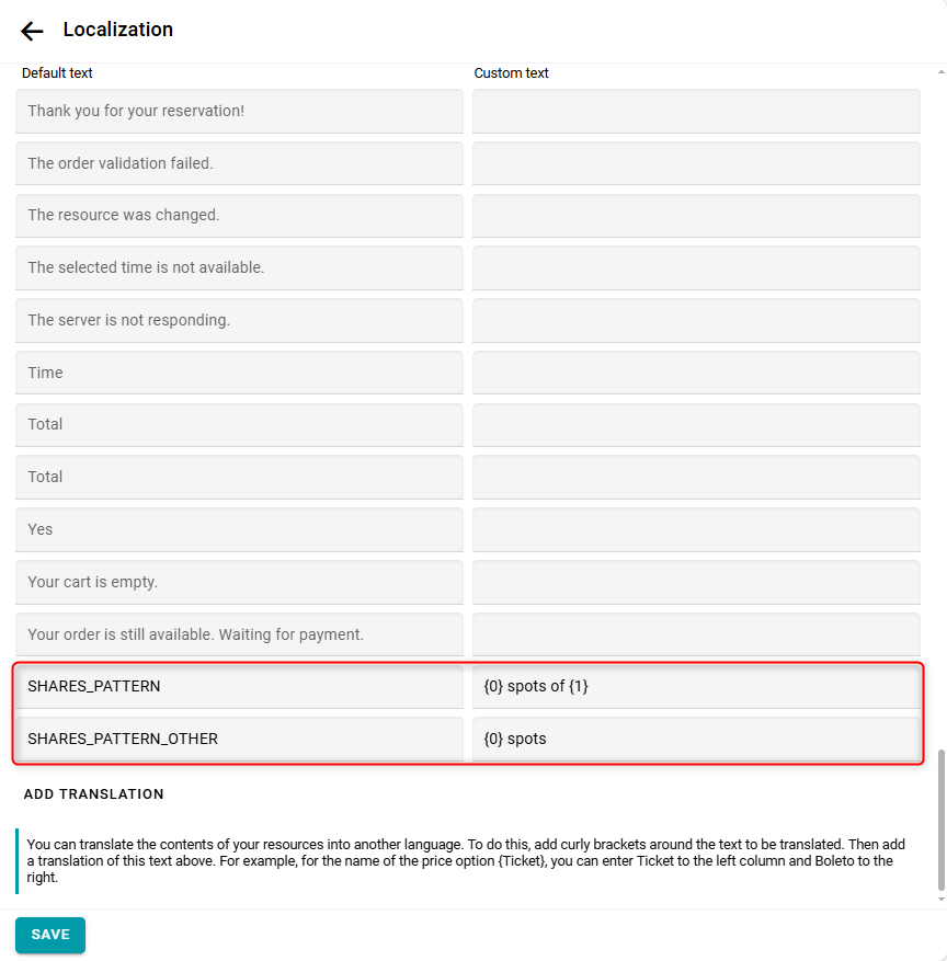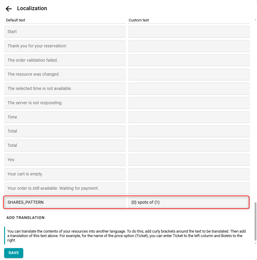 Add a new translation with the key SHARES_PATTERN and a value, for example, {0} spots of {1}. Here, {0} will be replaced with the number of remaining shares, and {1} will be replaced with the total number.