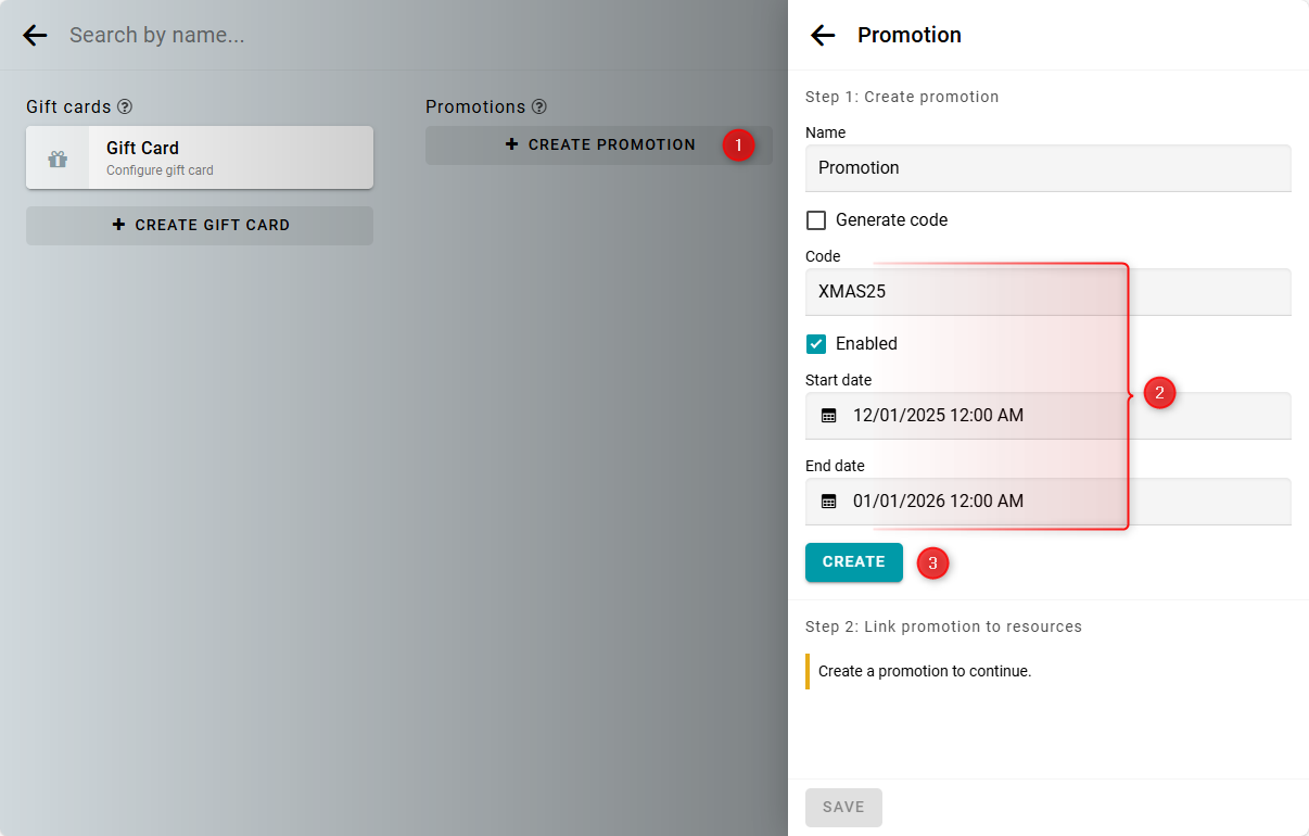 Enter the code, specify the period during which the promotion code is valid, and click Create.