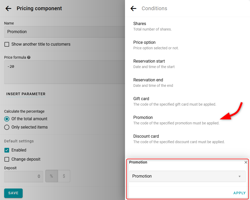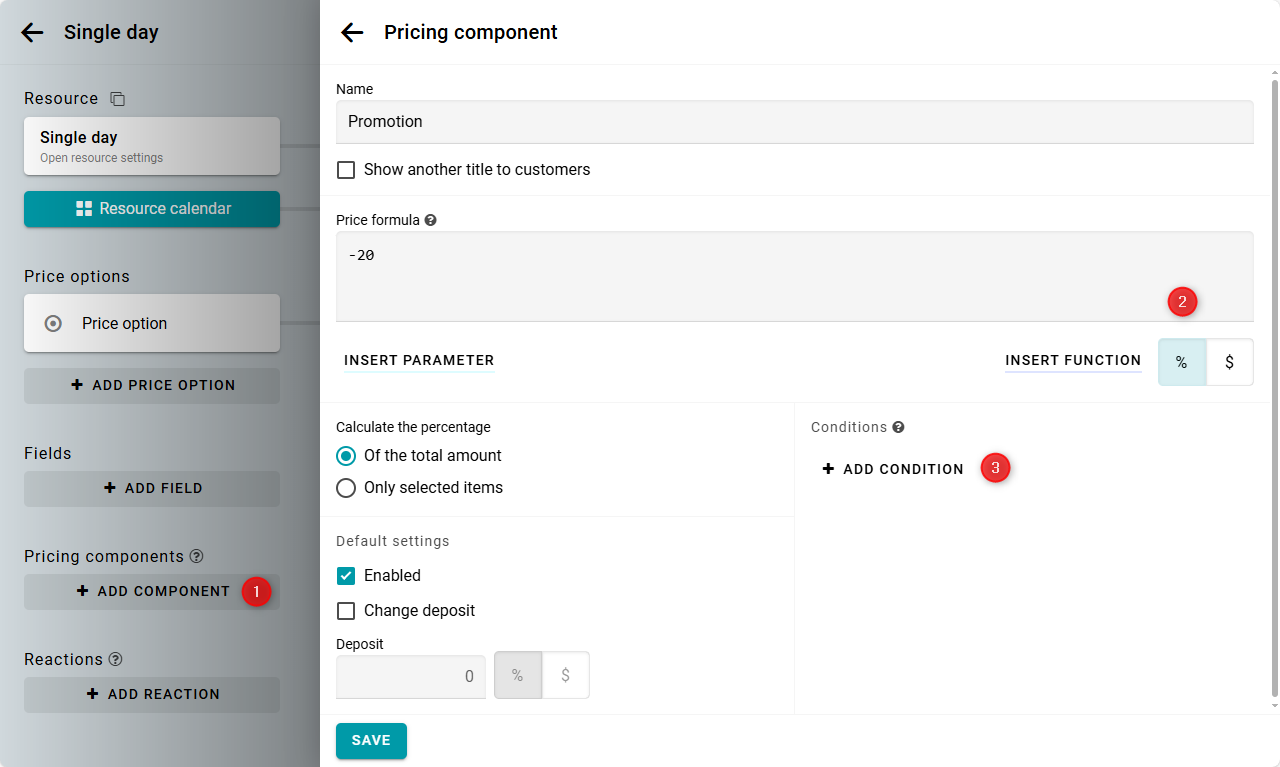 Specify the formula for the discount. For example, enter -20 and select percentage. Then click the Add condition button.