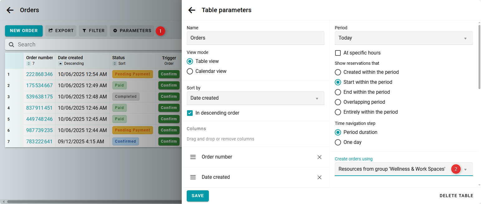 Next, open the Parameters of the table and select the widget or resource group you created for order management.