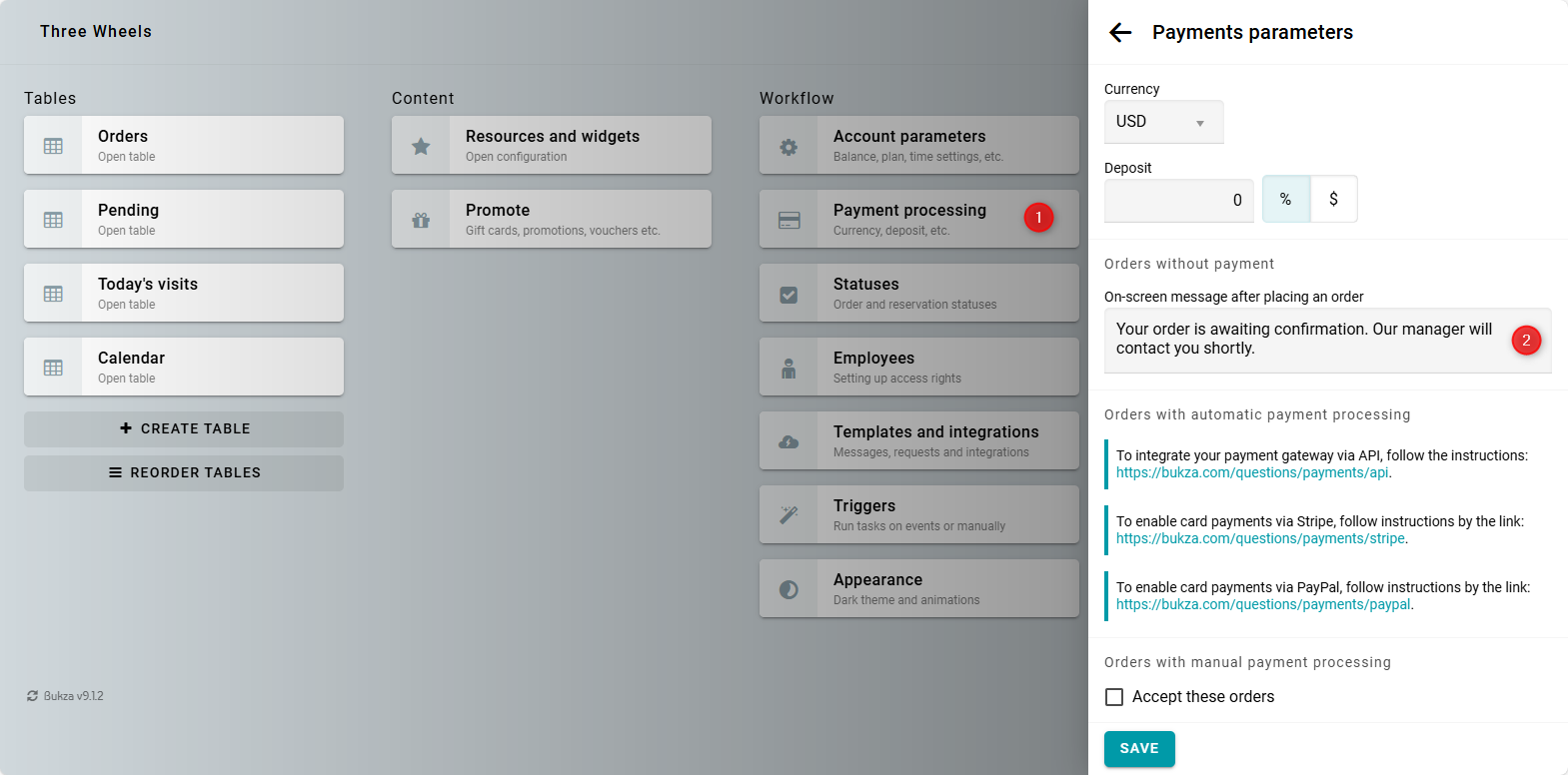 Go to the dashboard and click Payment processing. Enter the On-screen message after placing an order. For example: "Your order is awaiting confirmation. Our manager will contact you shortly."
