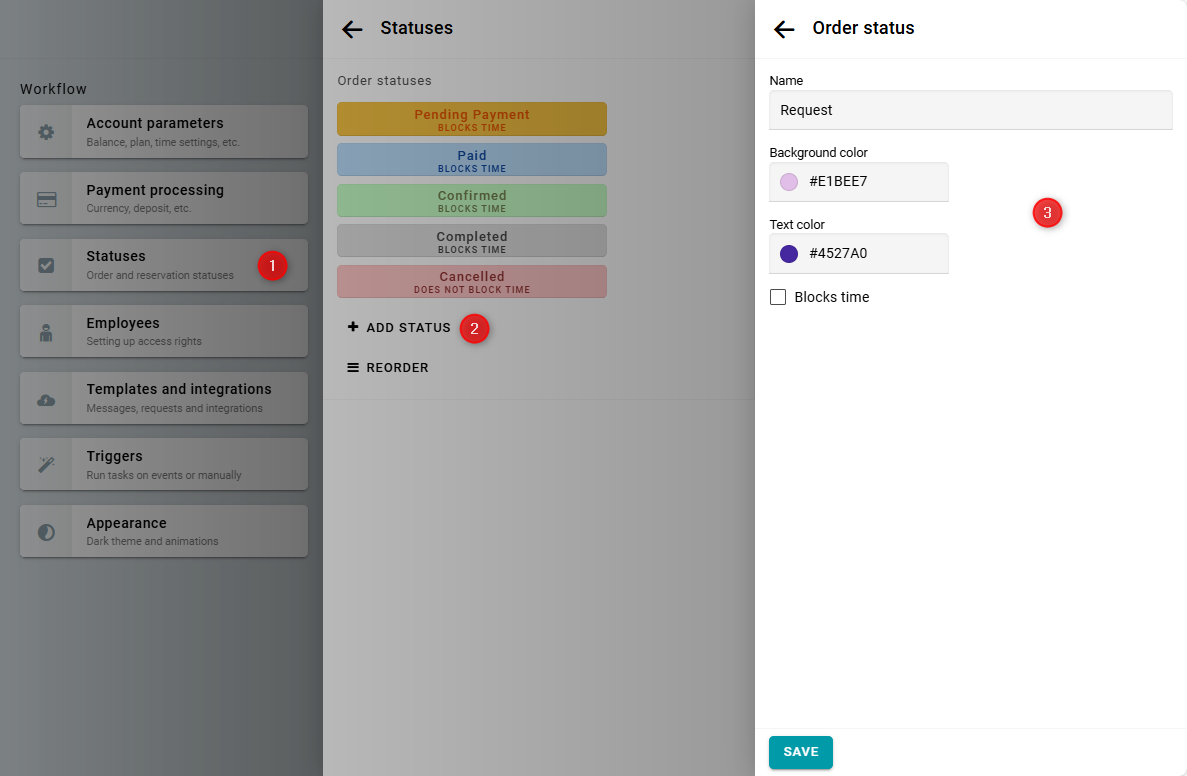 Next, return to the dashboard and click Statuses. Create a new order status. Enter a name, such as "Request". Select the status colors. Leave the Blocks time checkbox unchecked. Save the status.