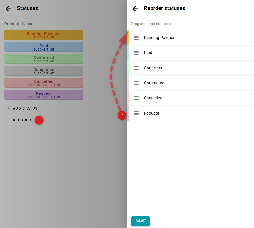 All new orders should automatically receive the "Request" status. To ensure this, make it the first status in the list. Click the Reorder button and drag the "Request" status to the top position. Click Save.