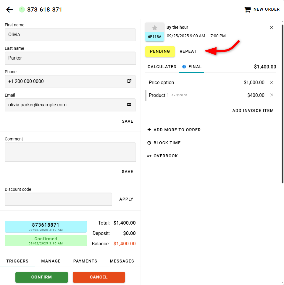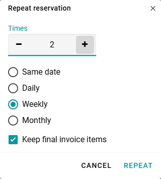 Specify how many times you want to repeat the reservation. Then select the interval and click Repeat. If you have modified the invoice in your reservation and want to apply these changes to all subsequent reservations, check the Keep final invoice items box.