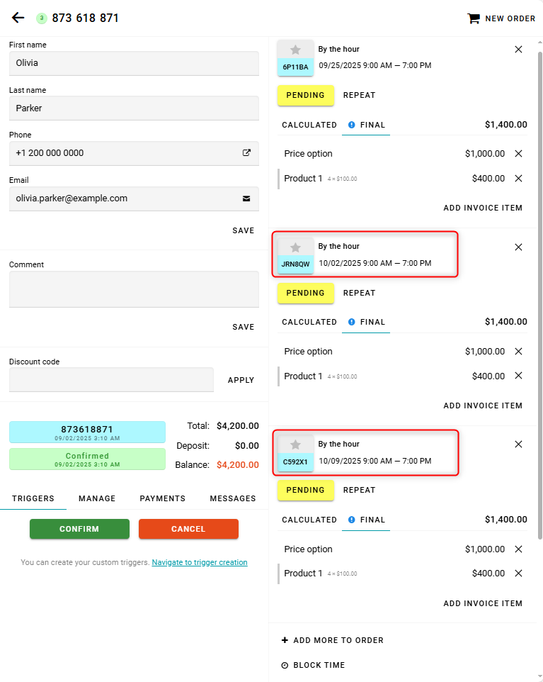 The new reservations will appear in the order immediately. Please note: if you repeat a reservation 2 times, there will be a total of 3 reservations in the order.