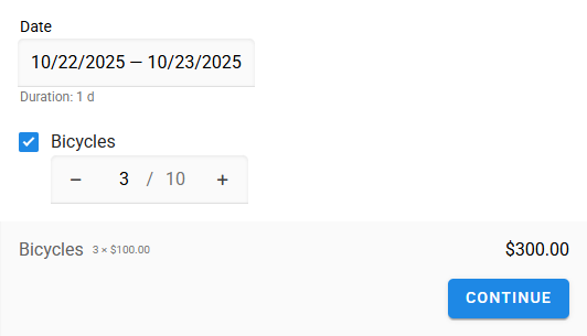 A resource can also have multiple instances. For example, 10 bikes. In this case, create a Shared price option, specify the number of shares, and set the price per share. The client will then select the number of bikes they wish to book.