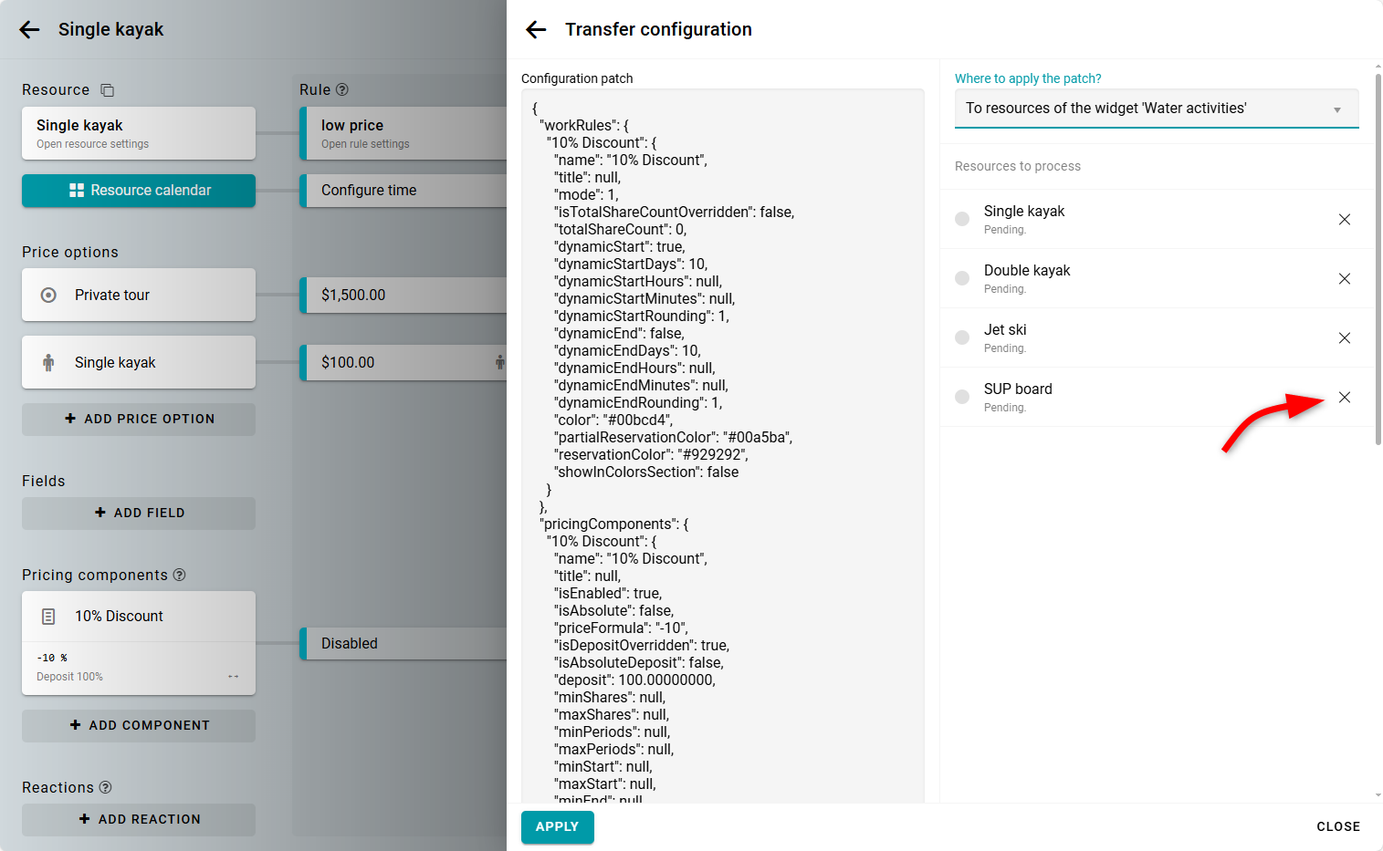 To delete configuration elements, open the resource that contains these elements. Click the Transfer Configuration button in the top right corner. Select the elements you want to delete from other resources, then click Delete from Resources.