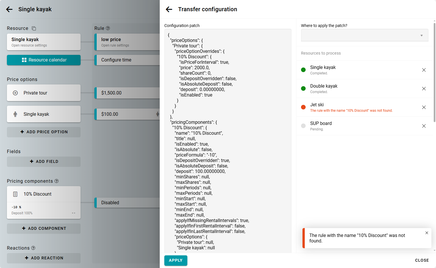 The patch uses the element name as the key for each type of element: rules, price options, fields, pricing components, and reactions. To update an element, it must have the exact same name in the target resource.