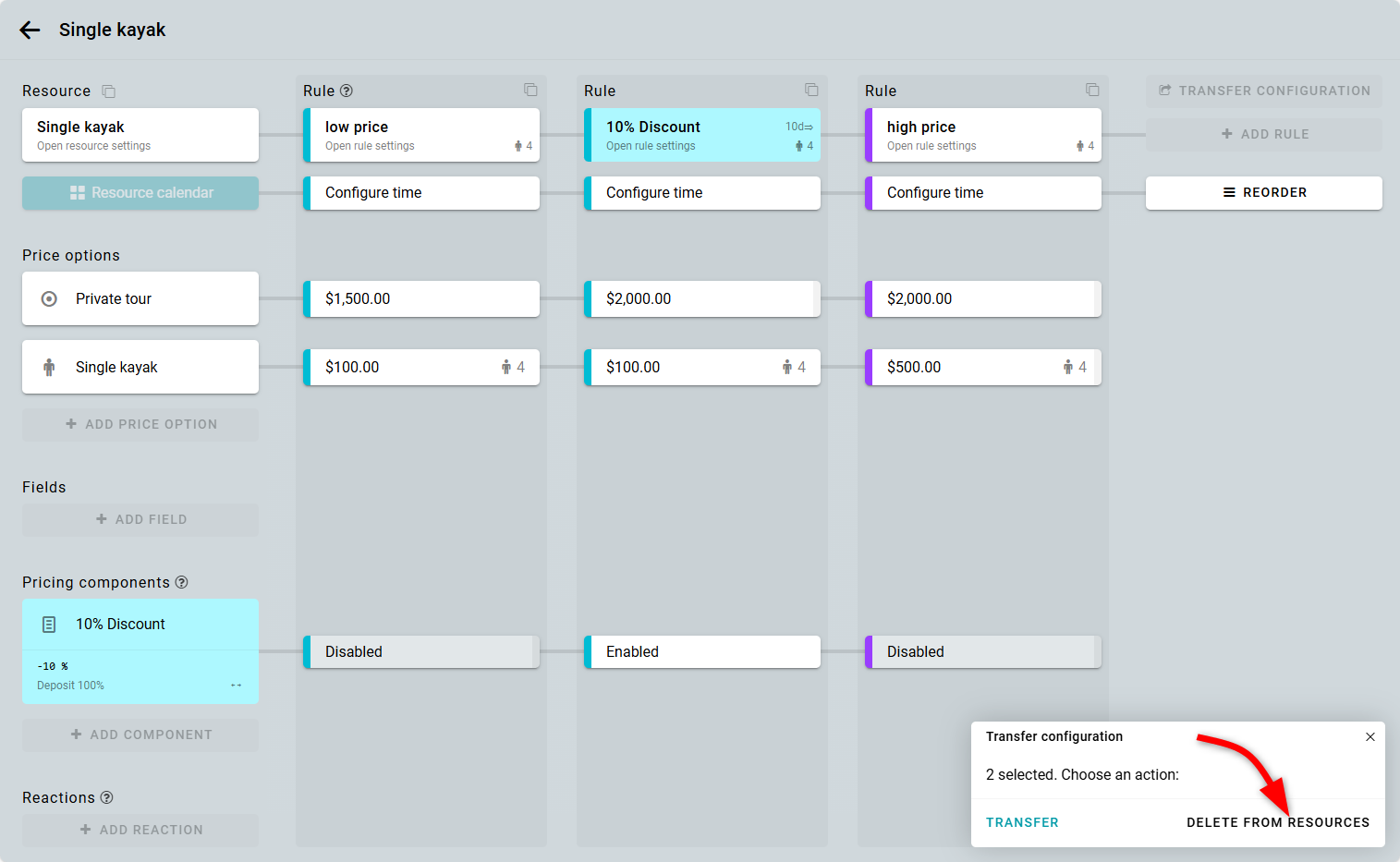 You can delete any configuration elements: rules, price options, fields, pricing components, and reactions. You can also delete overrides of elements at their intersections with rules. In this case, the element settings will simply reset to their default values.