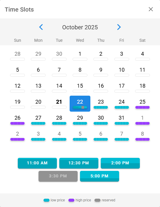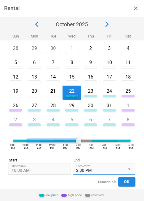 Rental refers to a period on the calendar that is divided into multiple steps, marked by points along the timeline. The client selects the start and end points separately. You can configure any schedule with any set of steps using rules in the resource configuration.