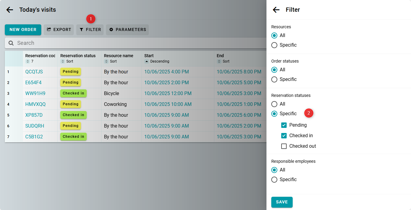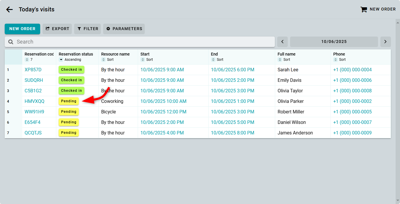 Open the Today's visits table. This table is already filtered to hide reservations for customers who have already visited.