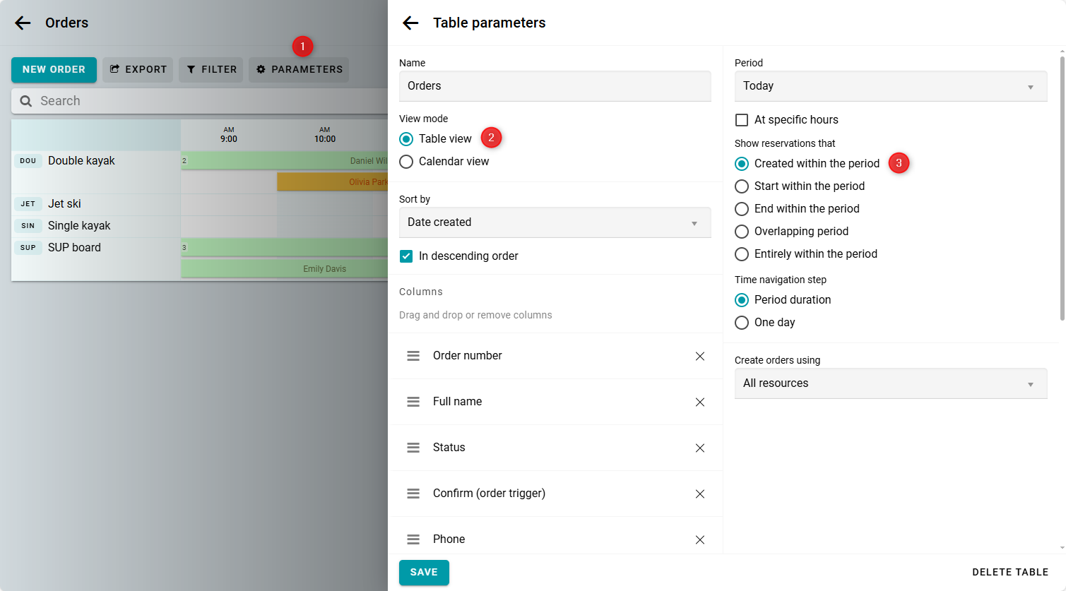 Orders cannot be deleted. However, you can remove all reservations from an order, and it will then disappear from the table. Additionally, if you completely delete a resource, all of its reservations will also be removed.