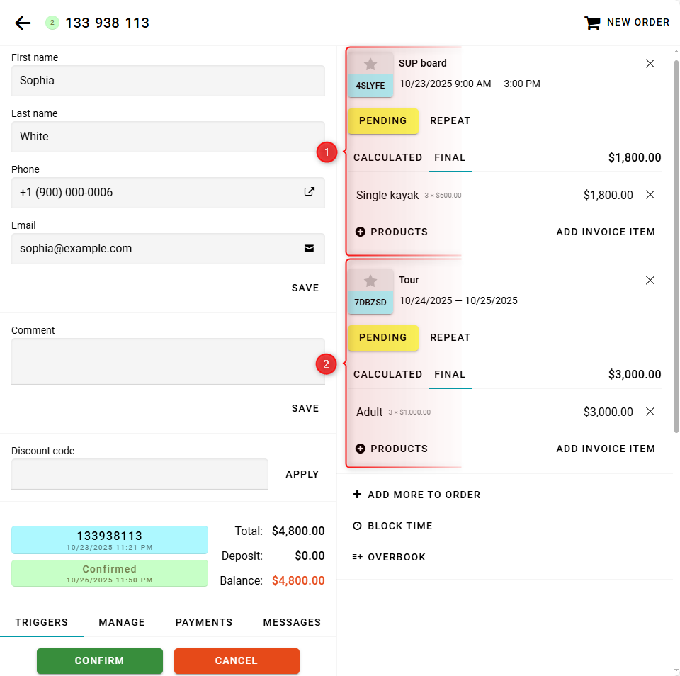 An Order contains information about the person who made the booking, when it was made, how it was paid for, and more. The order includes contact details, payment information, confirmation status, and other relevant data. Each order has a unique 9-digit number, such as 593235837.
