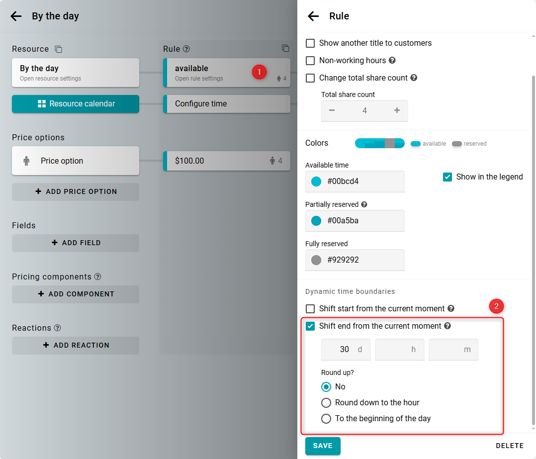 If rounding is not enabled, time slots will become available gradually throughout the day. To make the entire day available at once, select Round up to the beginning of the day. In this case, you will need to increase the shift by 1 day. For this example, set the period to 31 days.