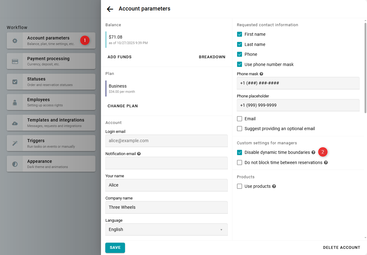 If you want managers to be able to make reservations without these restrictions, go to Account parameters. Enable the Disable dynamic time boundaries checkbox.