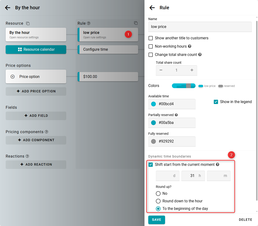 Open the rule settings. Set the Shift start from the current moment parameter to 31 h. Then, set it to round up to the beginning of the day. Save your changes.