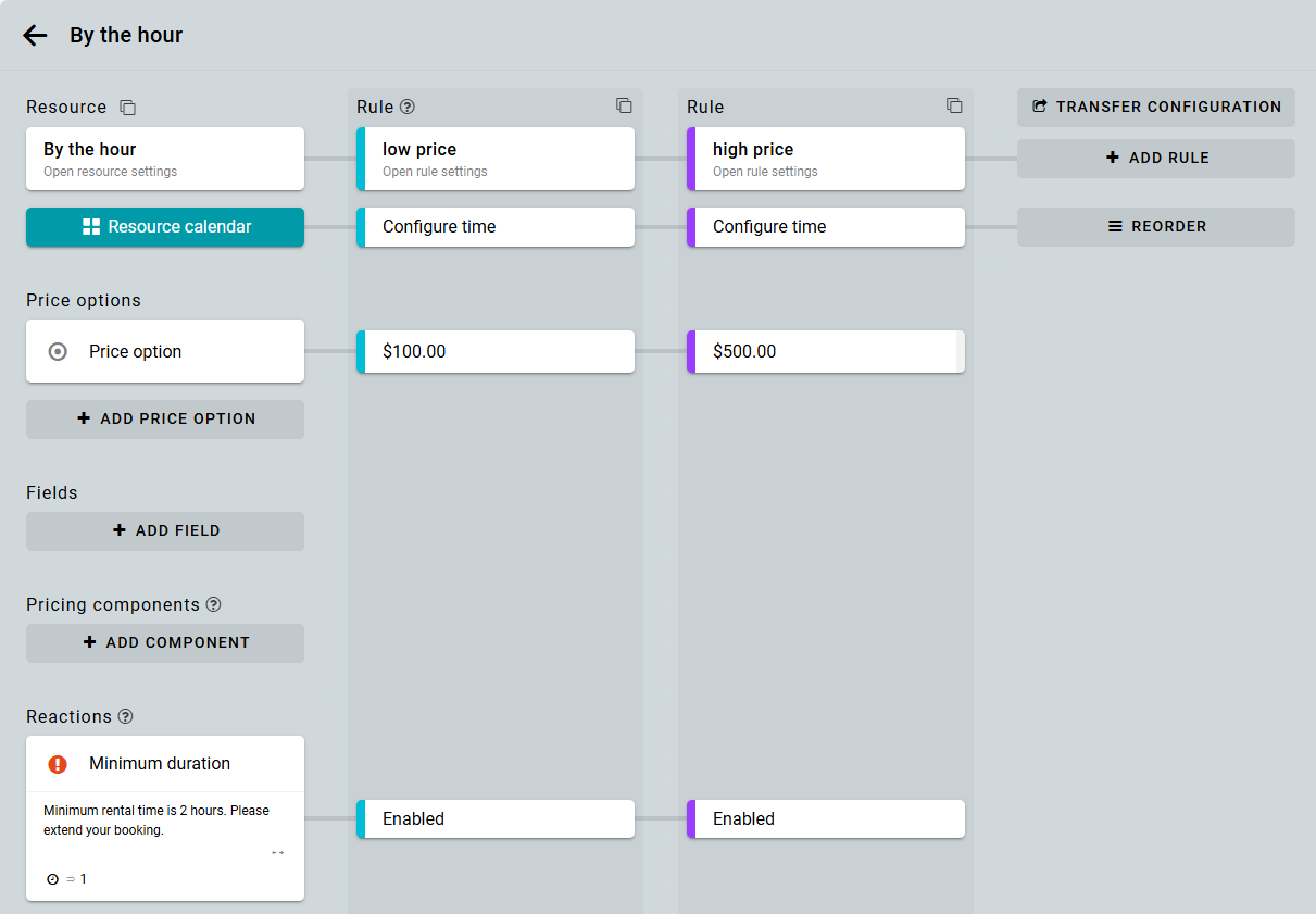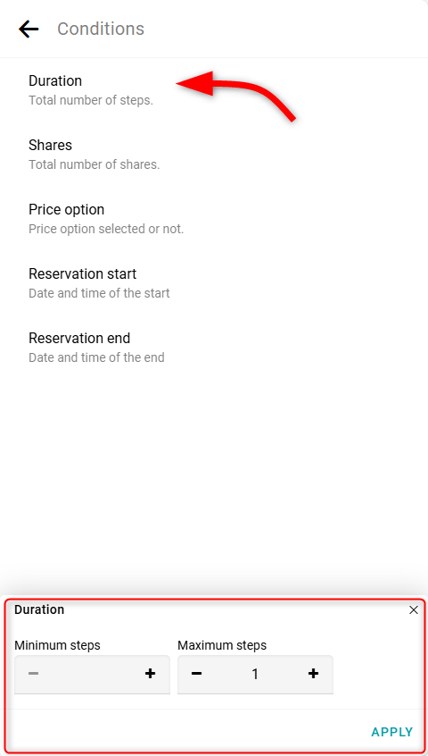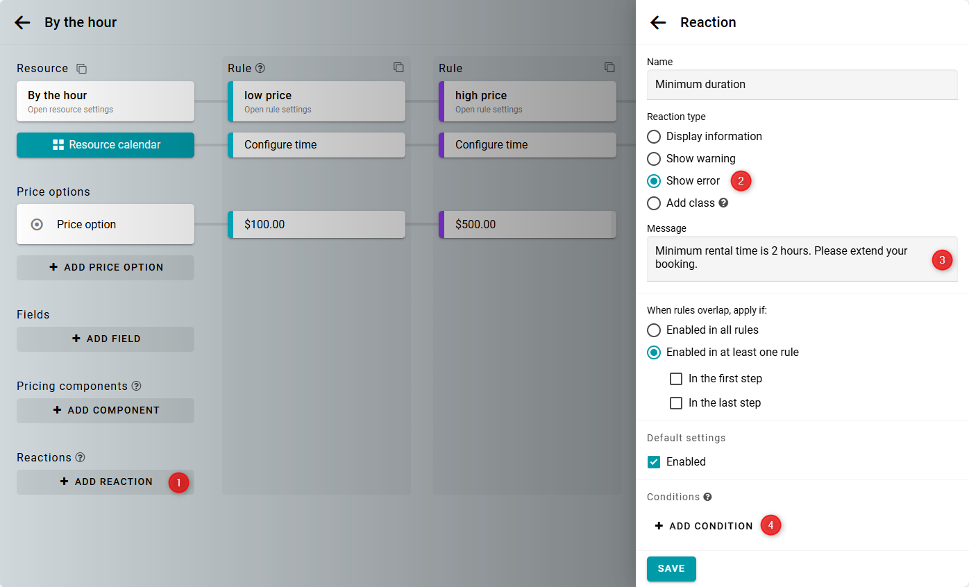 Choose the Duration condition. Specify the number of steps so that the message appears when a booking is for 1 hour or less. Apply the condition and save the reaction.