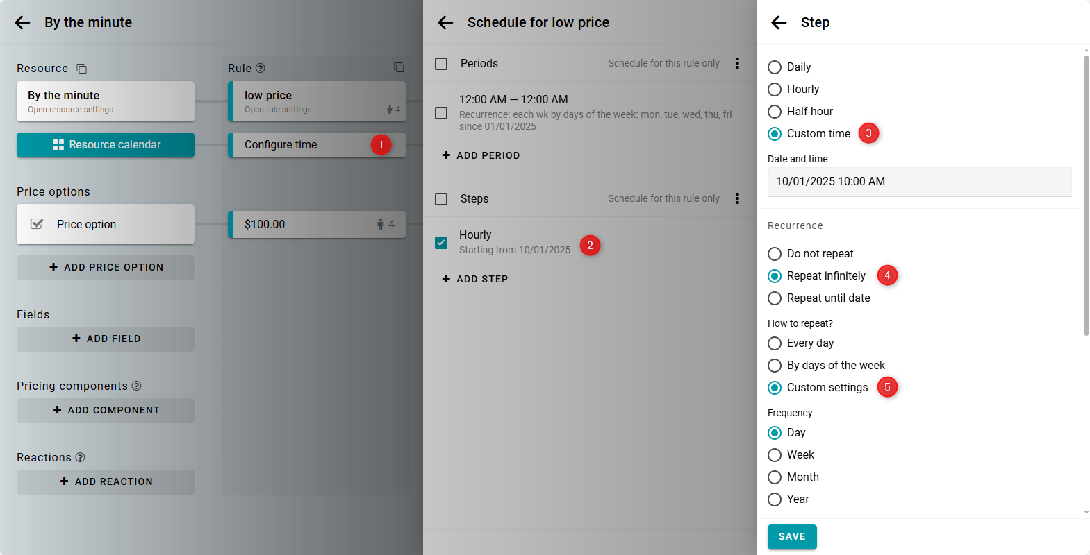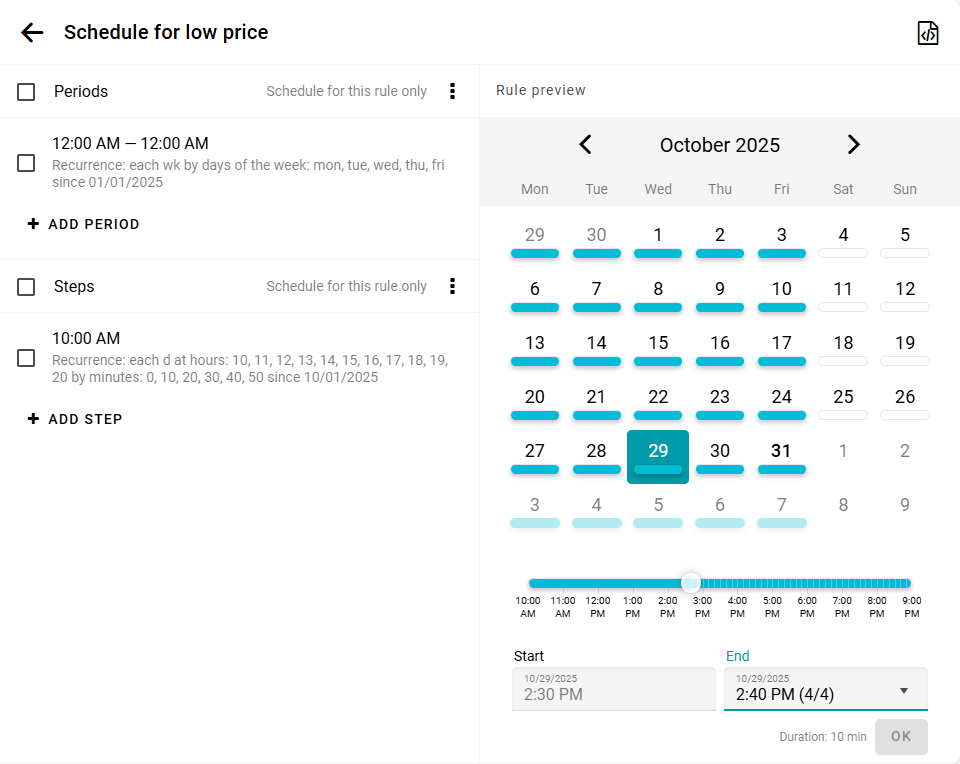 In the rules, You can also edit an existing resource. Open the calendar and click Add step, or edit an existing step. Select Custom time, specify your own date and time and set it to Repeat indefinitely. Then choose Custom settings.