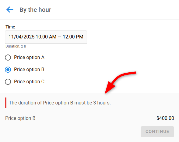 You can, however, validate the selected duration. If the customer selects an invalid combination of duration, price options, or fields, a validation error will be displayed in the widget.