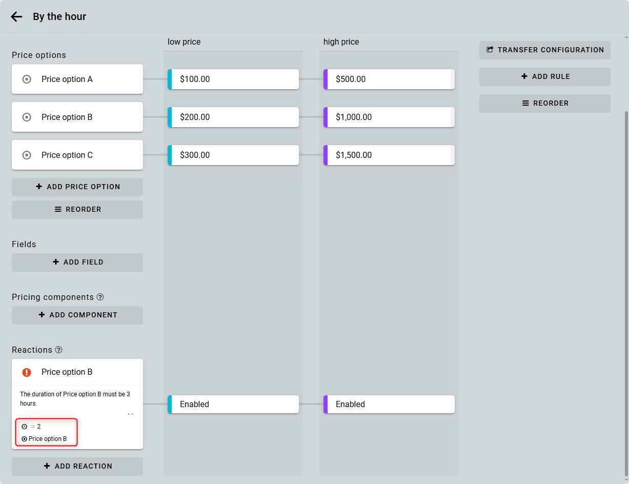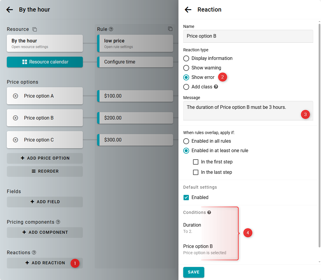 To do this, create a reaction of type Error. Then add the condition that the duration must not exceed 2 hours and that Price option B is selected.