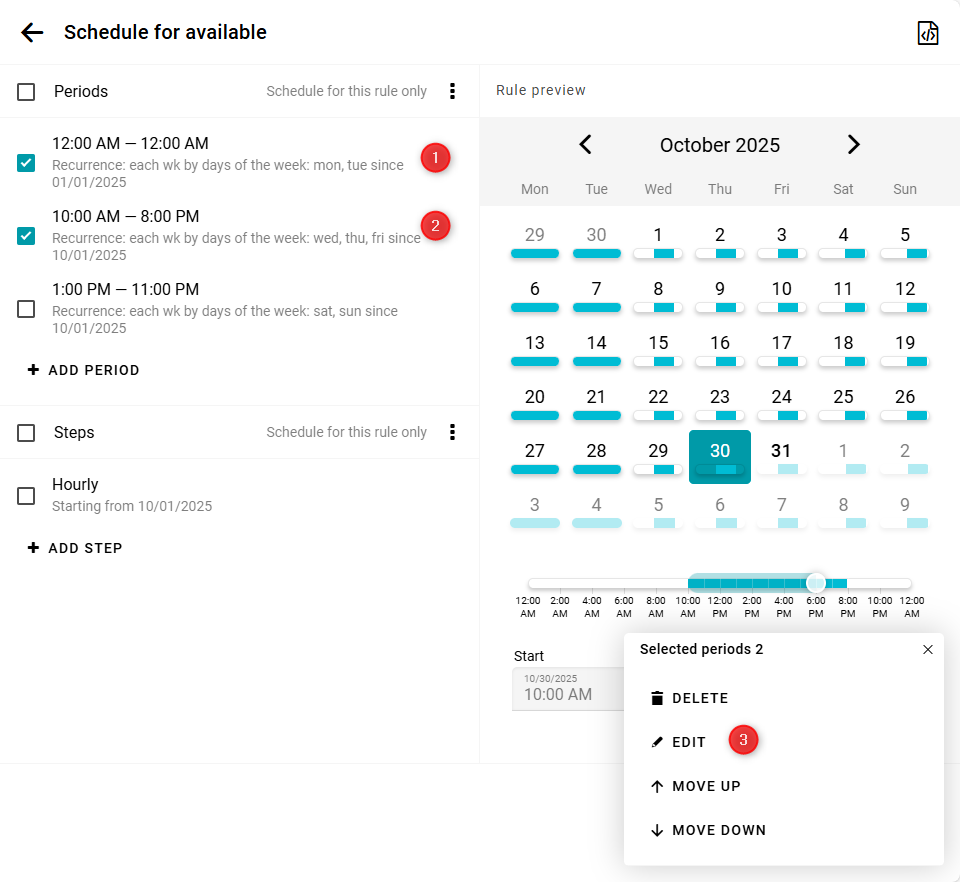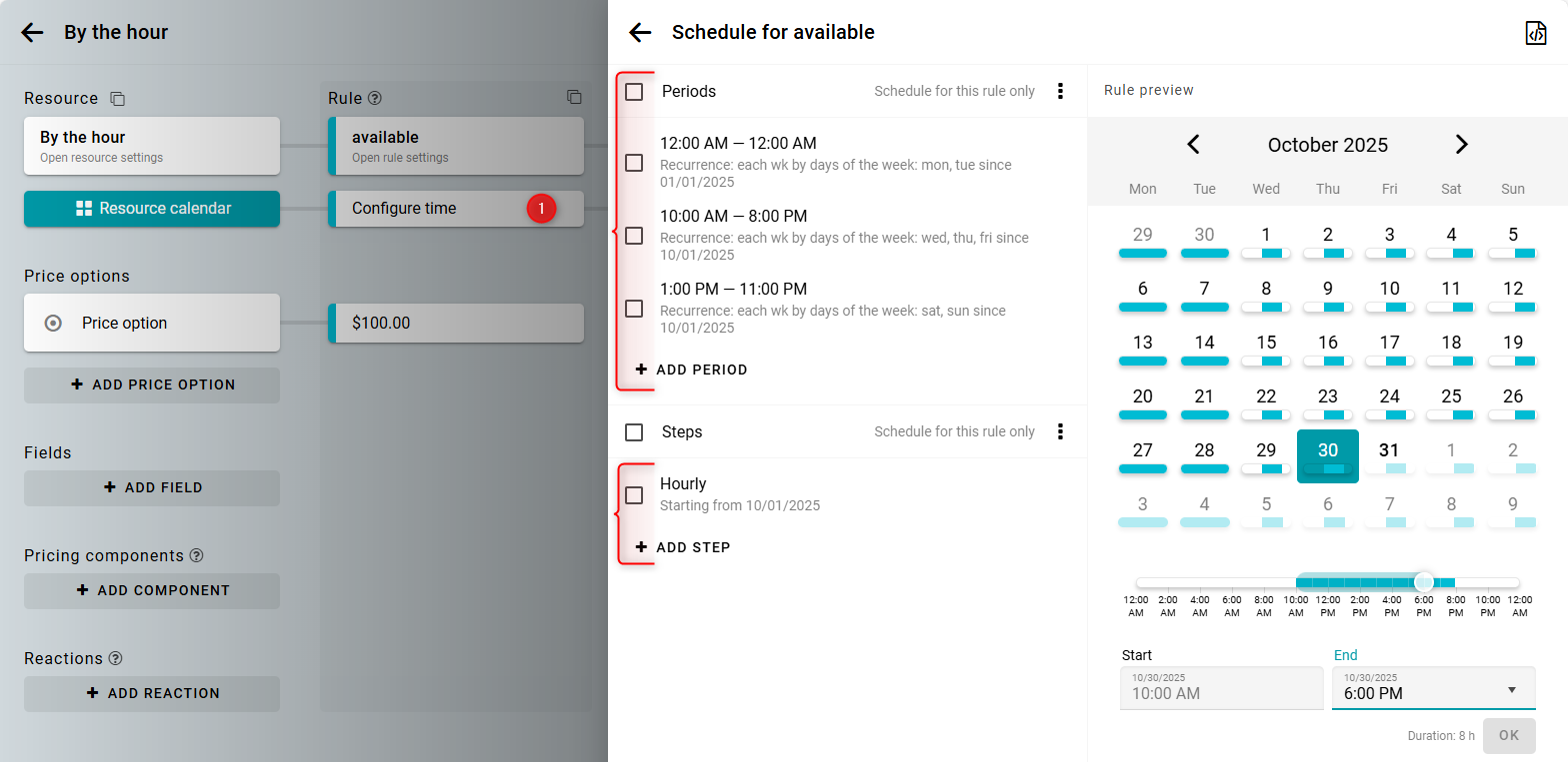 In the rule's time configuration, you will find settings for Periods and Steps. Steps are applicable to resources of the Rental type.