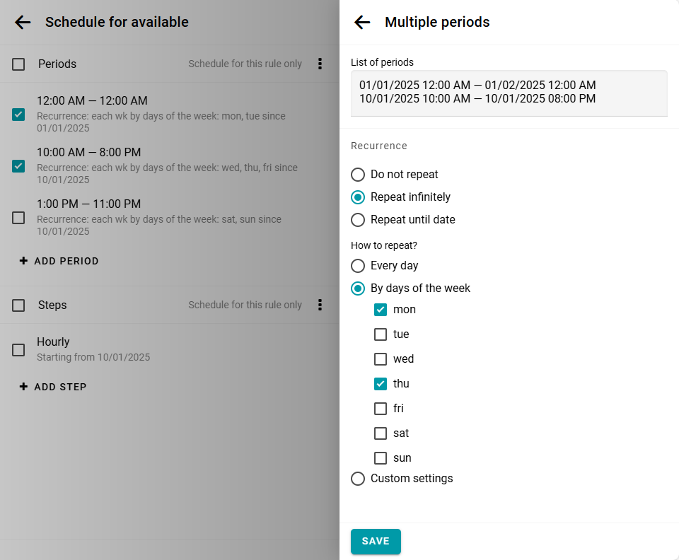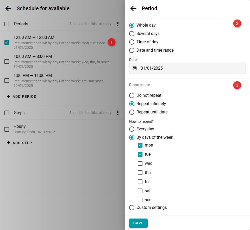 Periods can be set to repeat over time according to various rules. To configure the recurrence of a specific period, click on the period. Then, specify the desired recurrence pattern.