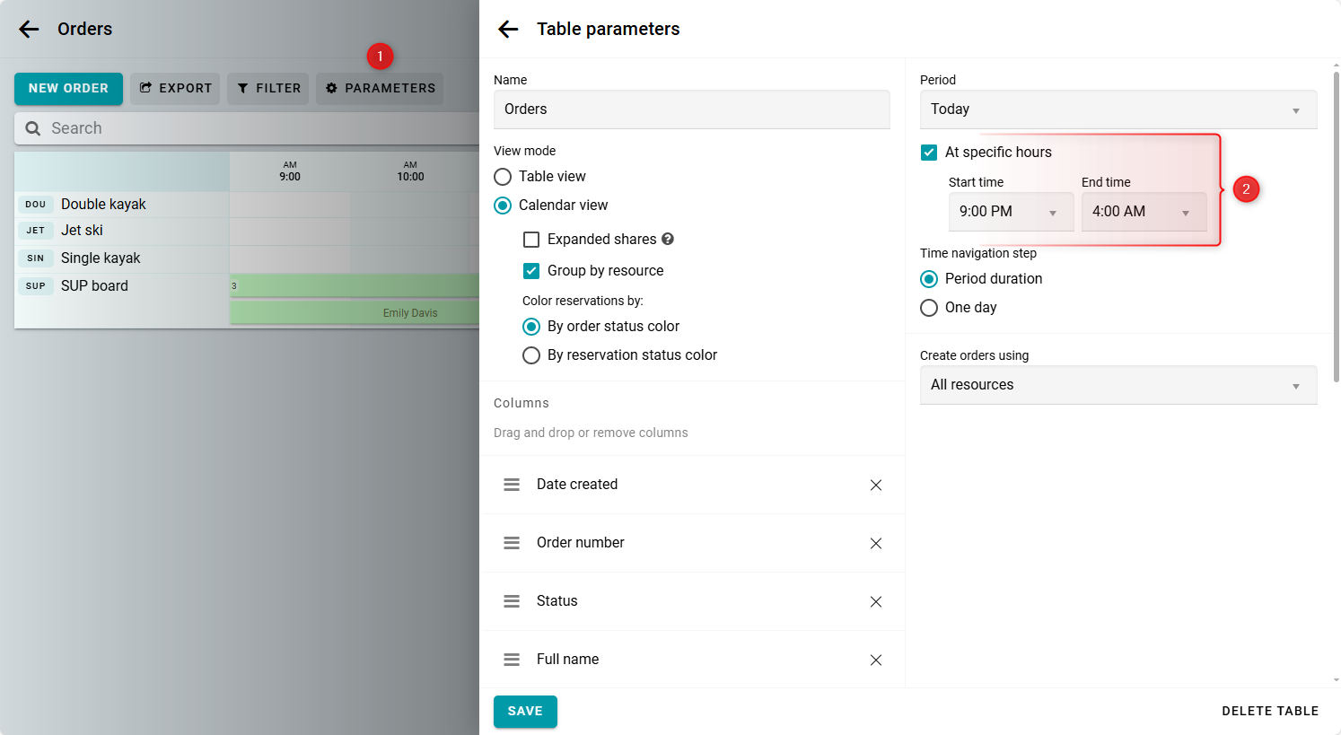 You can also set the desired time range in the manager's table. Open the table settings. Select the period Yesterday, Today or Tomorrow. Check the At specific hours option. Then, set the start and end hours.