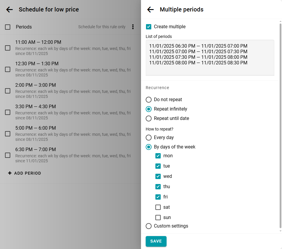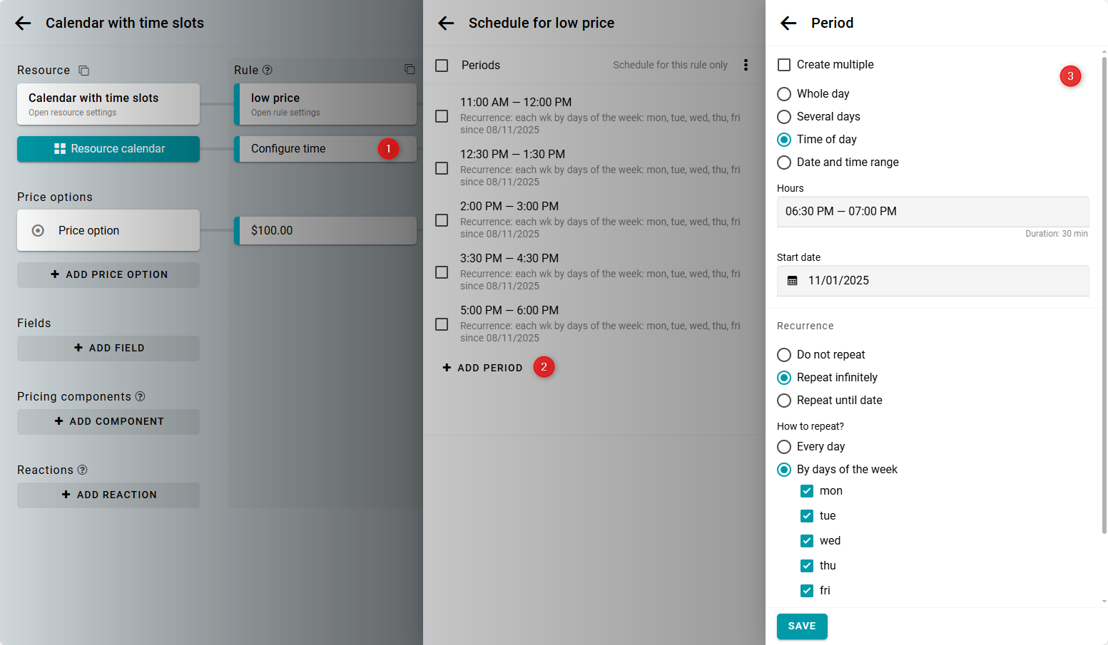 If you have many slots, you can add multiple periods at once and set the desired recurrence.