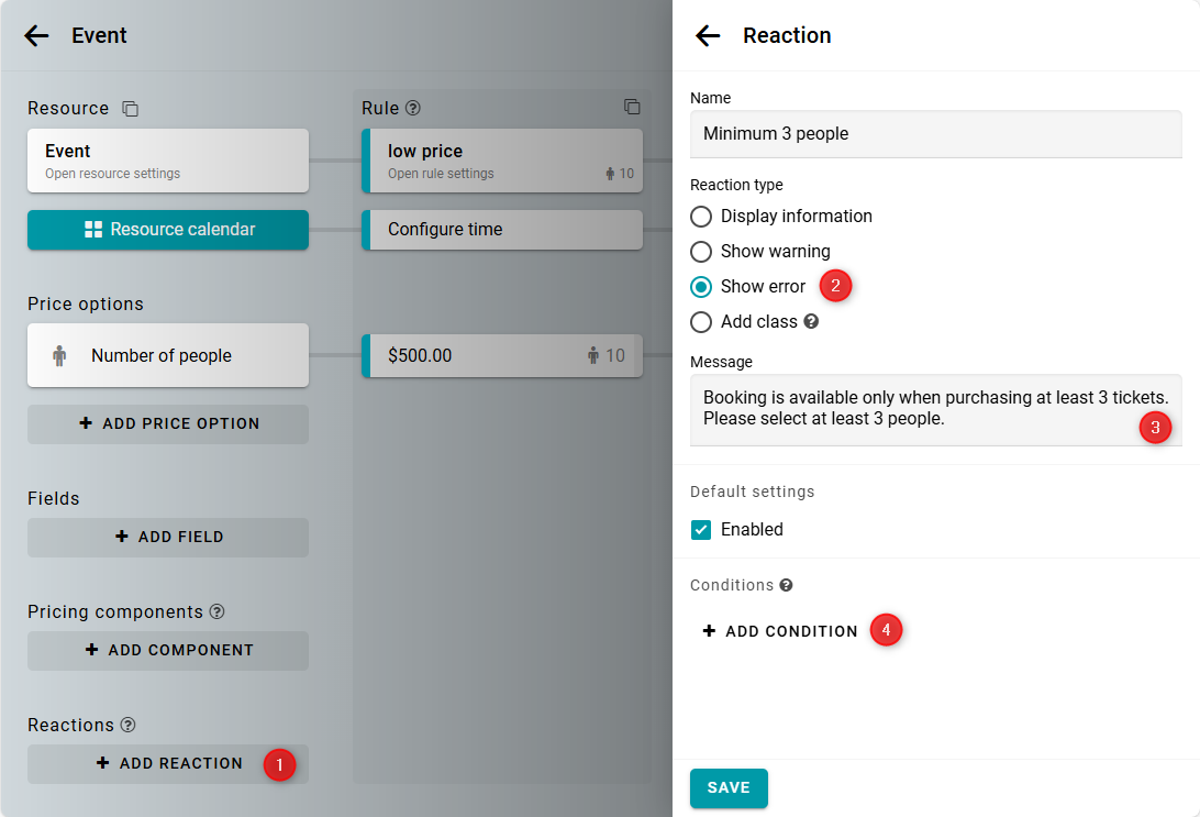 Enter a name. Select the reaction type — Show error. Enter the error message text and click Add condition.