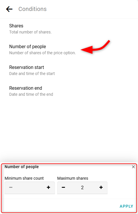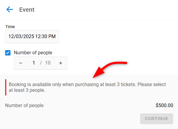 Select Number of hares of the selected price option and set the maximum value to 2. This will prevent users from booking one or two tickets. Save your changes.