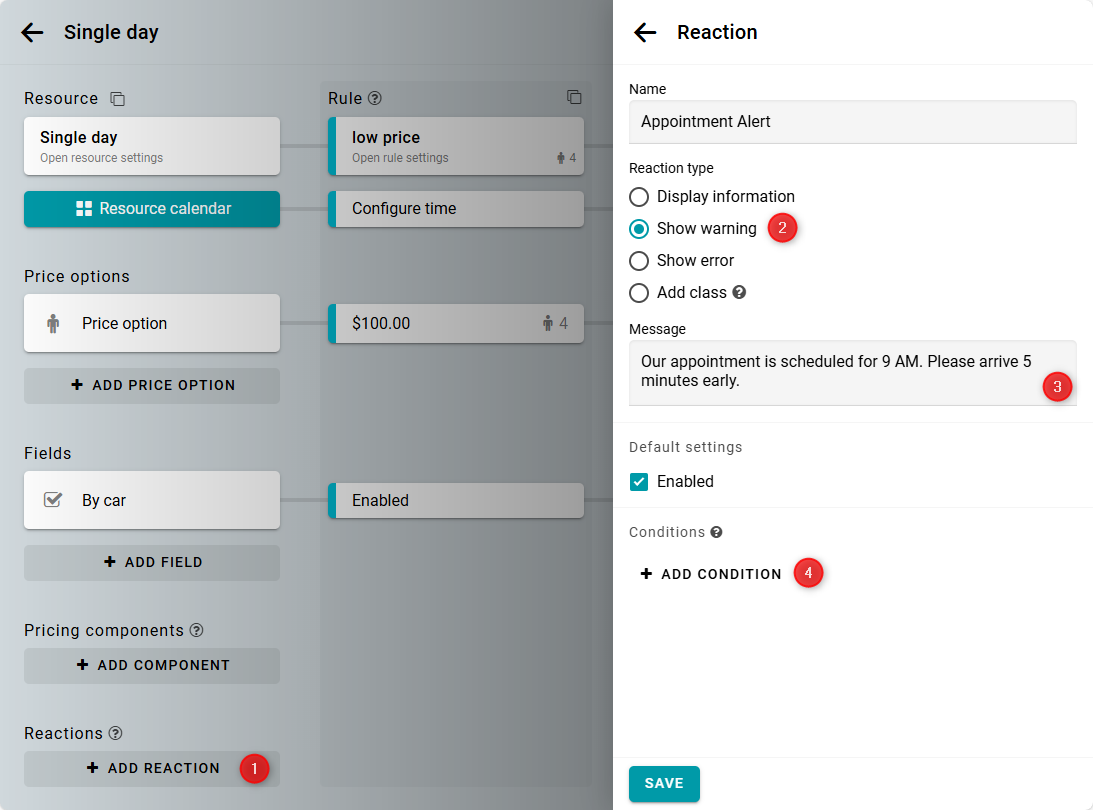 Enter a name. Select the reaction type — Show warning. Enter the warning message text and click Add condition.